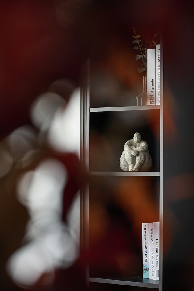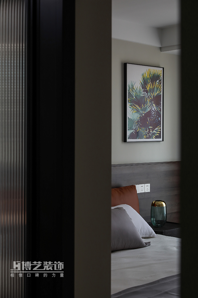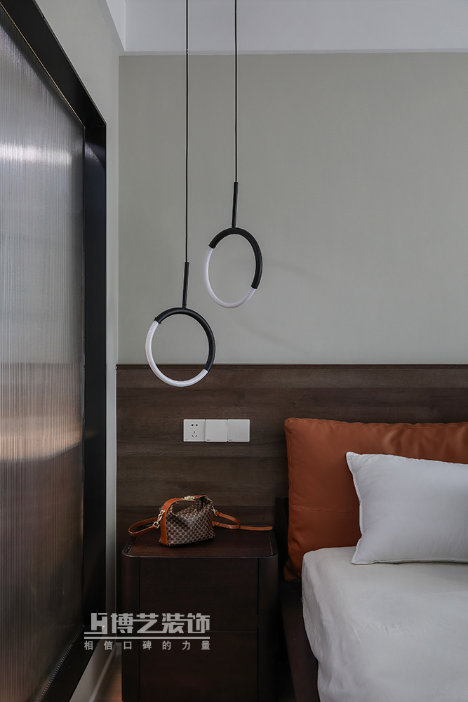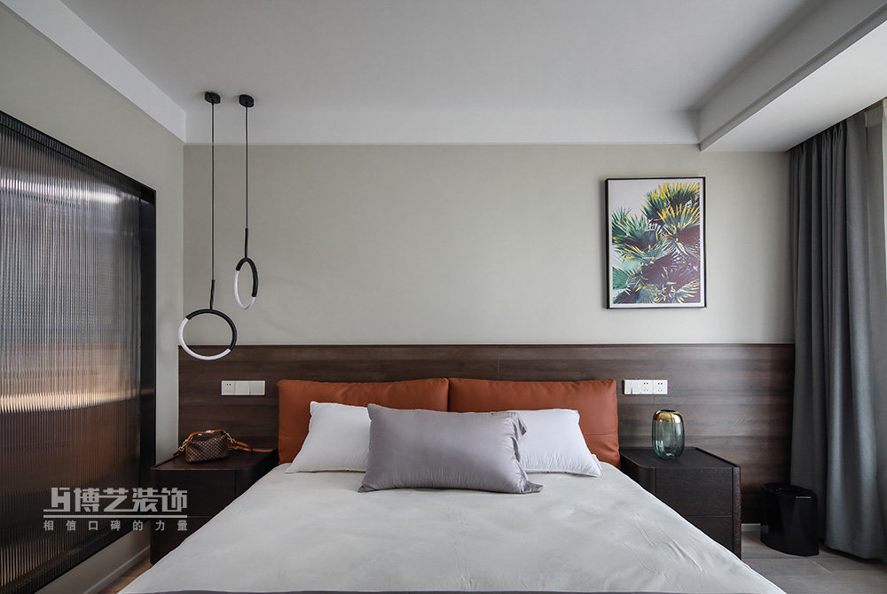 通透的格局使光線充分涌入,淺草灰賦予的清冷與木作沉淀的細膩互為羈絆,細細鋪展,床頭橙色的軟枕弱化了空間的單薄,飽滿了一室熱烈的浪漫。