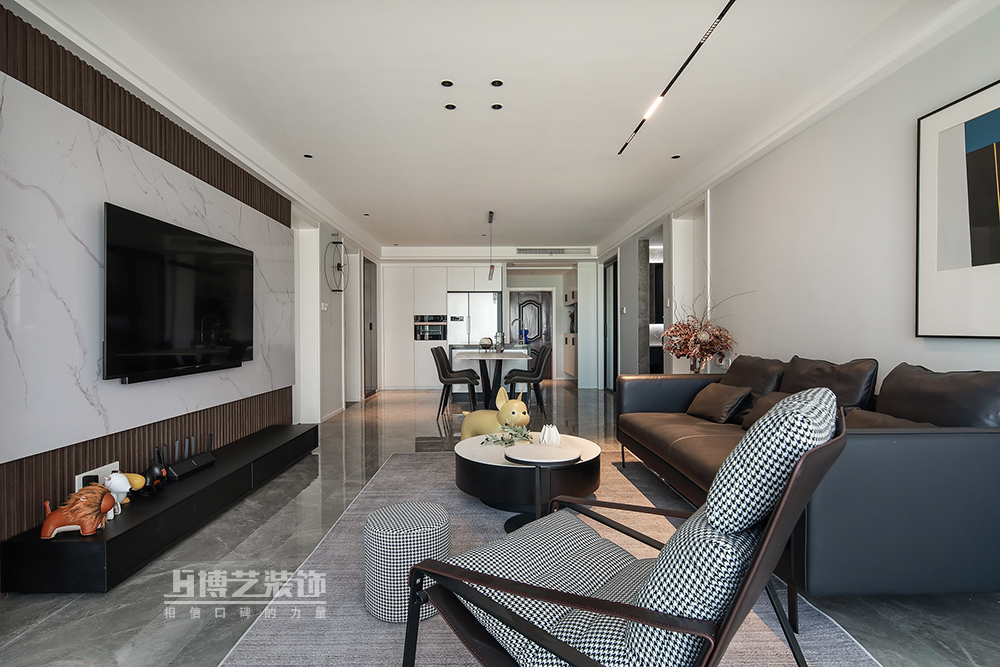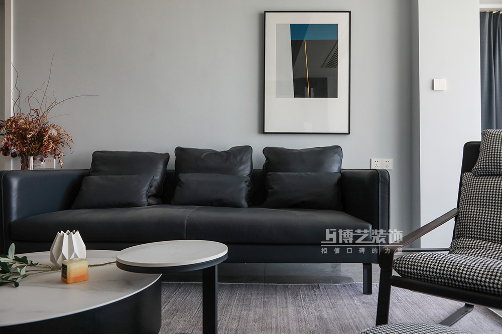 簡單的硬裝線條勾勒出客廳的開闊空間,黑色的皮質沙發(fā)置于其中,在光與影的微妙律動中,穩(wěn)穩(wěn)的拿捏著氣質,色彩豐富的卡通玩偶消弭了這素色場域里的冷傲,帶來溫馨與生氣。