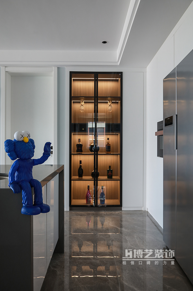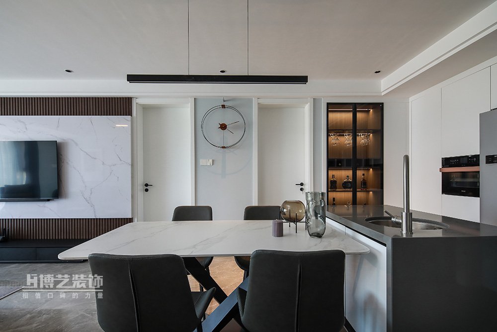 餐廳延續(xù)客廳的極簡風格,設計了島臺,增加西廚功能,豐富主婦烹調美食的樂趣。一側的餐邊柜作為男主人收藏之用,燈光與灰玻的結合也是視覺上妥妥的C位。