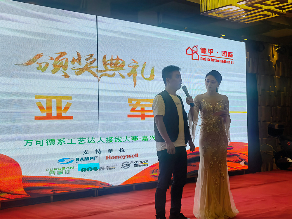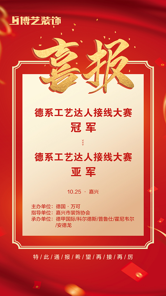 2021年10月25日,在嘉興中港城舉行的德國萬可德系工藝達人接線大賽中,博藝裝飾的電工師傅們以過硬的工藝技能和穩定的心理素質脫穎而出,分別榮獲比賽冠軍和亞軍的殊榮。