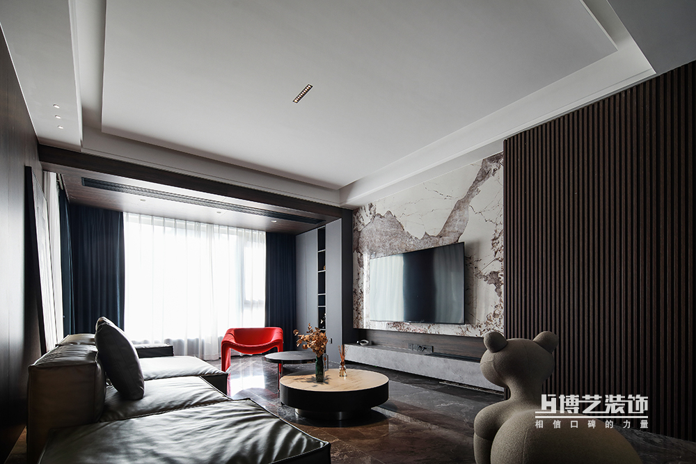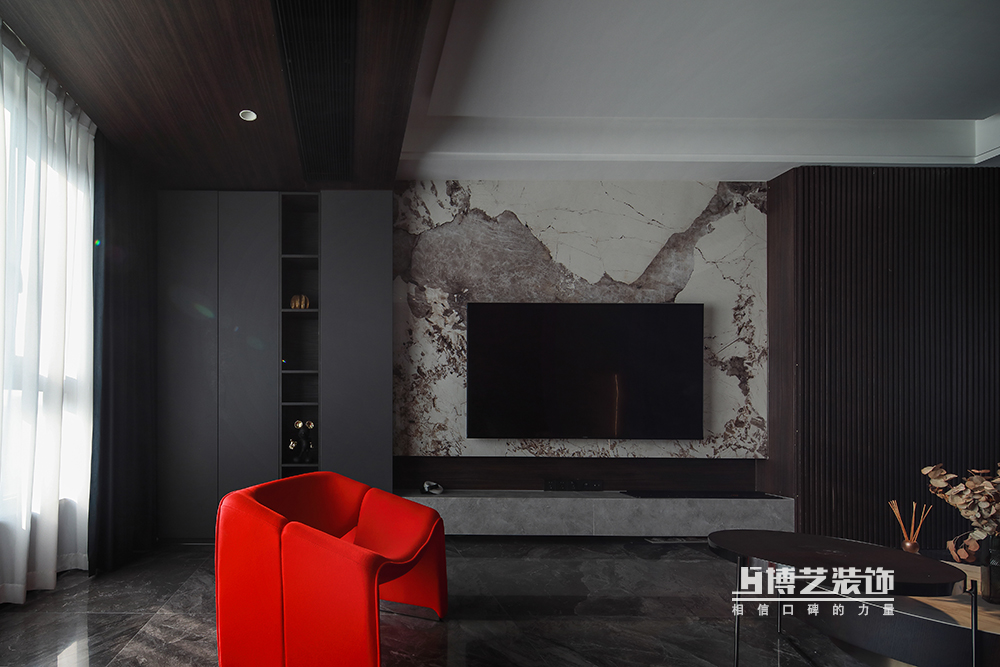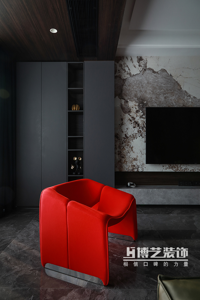 木飾面環繞的客廳空間溢出滿室的溫情,大理石的應用很好的中和了多余的膩味,一把搶眼的紅色單椅,仿佛是空間中注入的光讓生活有了新的定義。