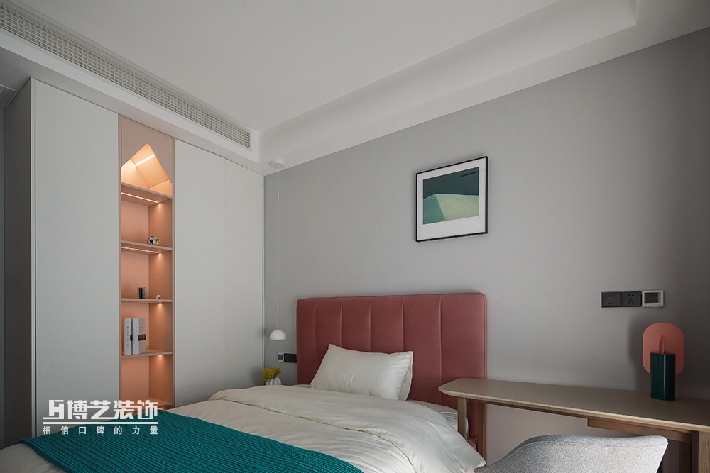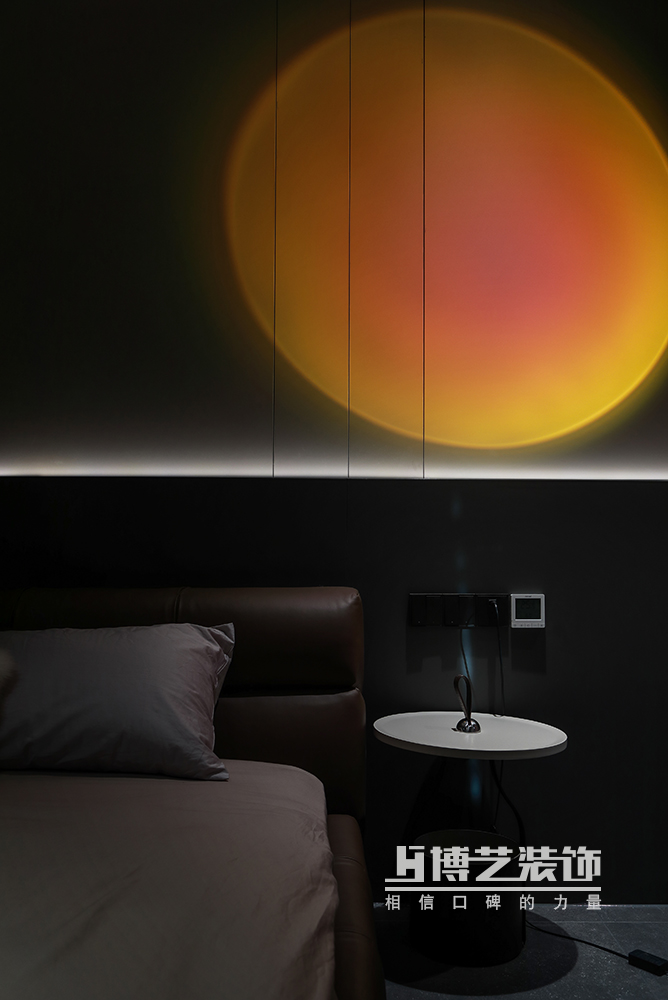暗色調的臥室,自然地形成一個靜謐的場域,一盞日落燈暈染了溫柔的氛圍,這是為你準備的“盛宴”。