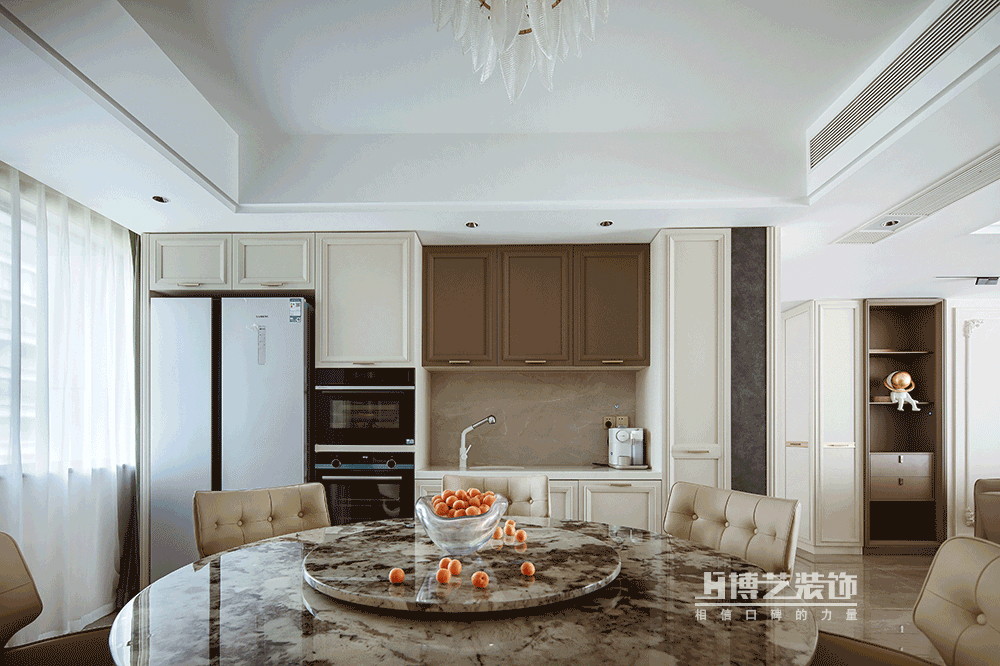 餐廳加入的西廚的設(shè)計,使得廚房的功能更加完善。與餐邊柜的結(jié)合又很好的滿足了收納的需求。