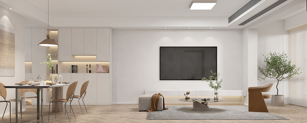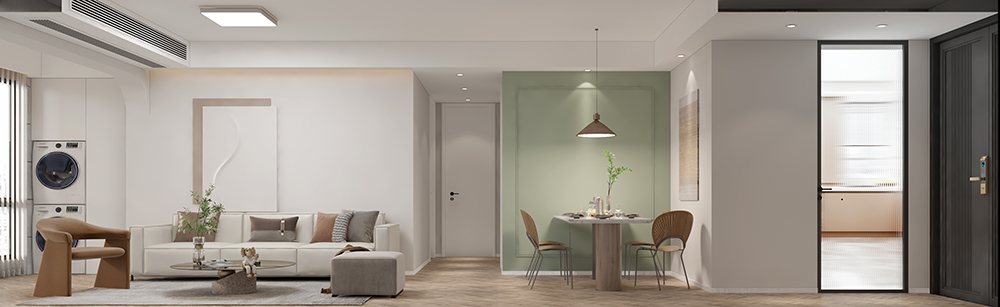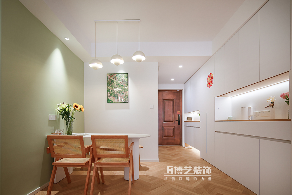入門是一組延伸至餐廳的收納柜,白色的柜面,樸素且優雅。散發的柔光是靜靜守候的家的溫暖。