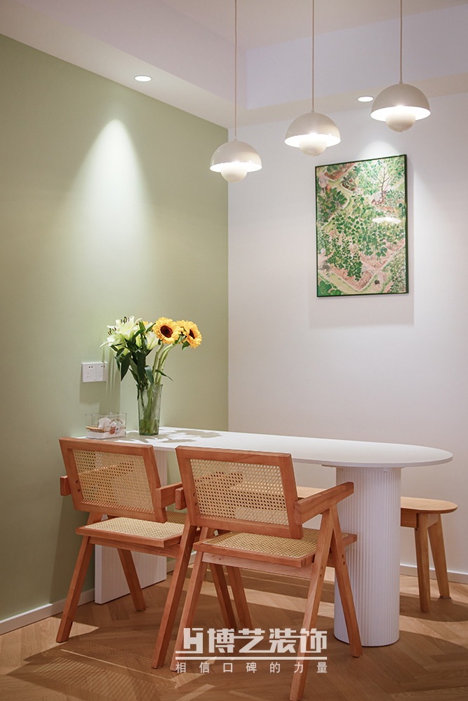 白色餐桌搭配原木編織的桌椅,帶來自然的溫度。盛開的鮮花,是對生活小小的儀式感,帶著美好品嘗人間煙火。