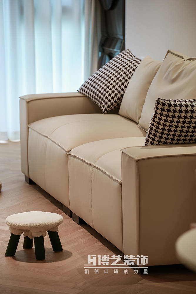 埡口的下梁被設計成一彎圓弧,泛起一室的柔軟。魚骨拼的地板彰顯著自然的肌理與布藝的沙發共同組成溫馨的家。