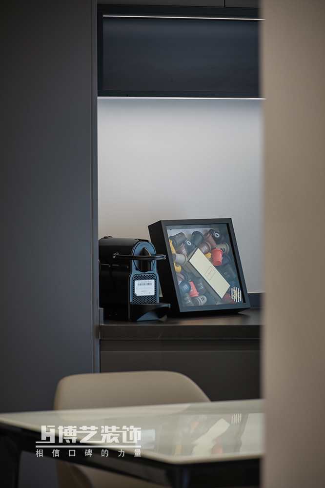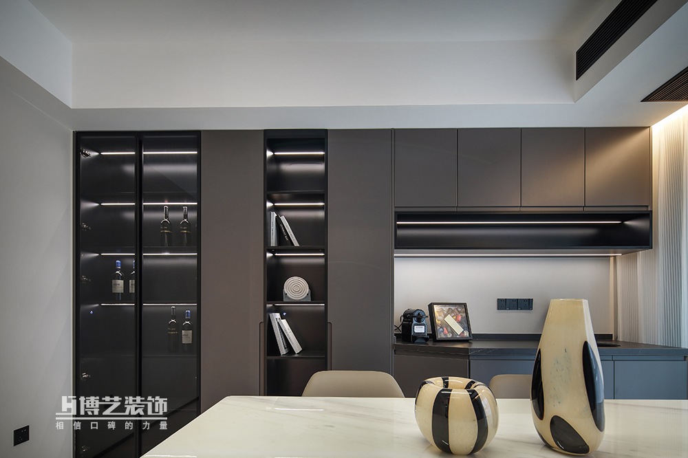 西廚緊挨著廚房,半開放的設計保證油煙不外散。小吧臺的設計兼具收納功能,同時方便日常簡餐,閑時亦可與家人朋友小資一刻,悠悠半日閑。