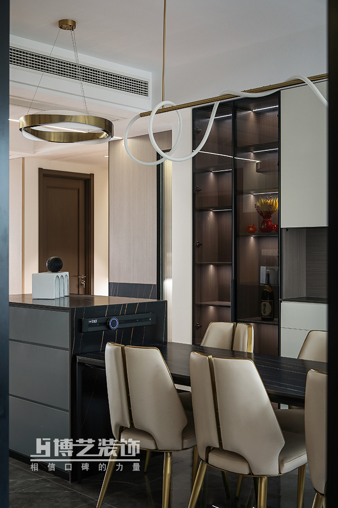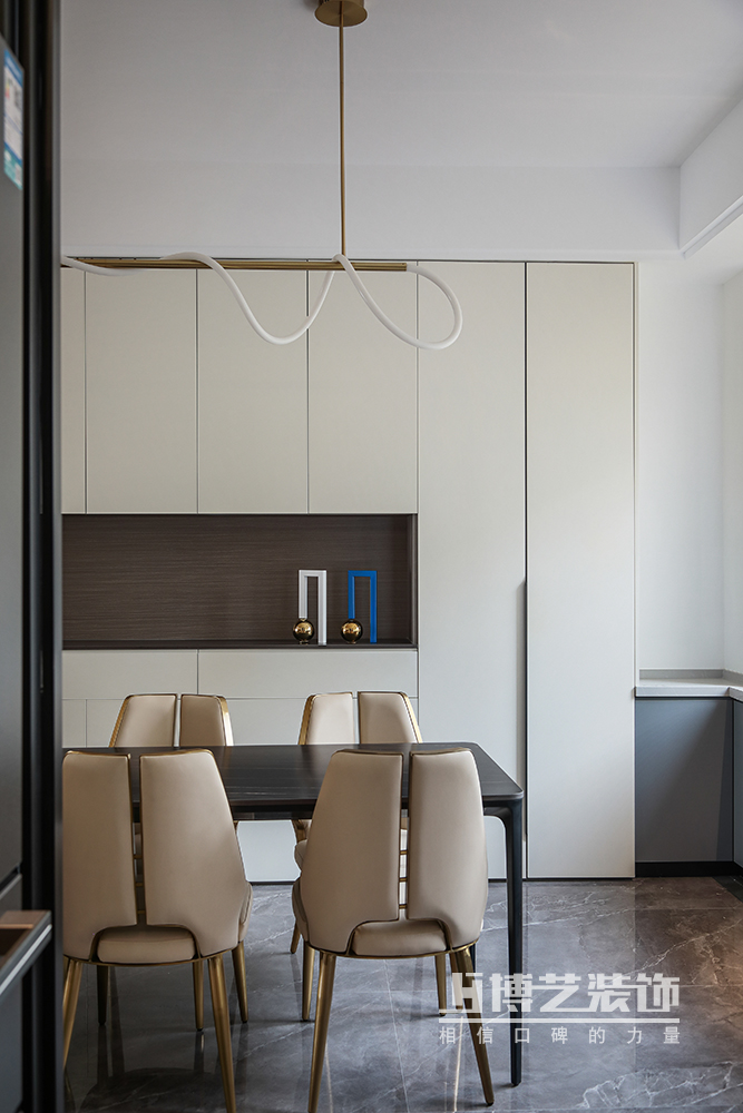 餐廳做“回”字型結構,寬敞的空間滿足六口人進餐而不被擁擠。兩邊的餐邊柜增加了更多的收納功能,靠近門口的一側做換鞋凳,方便生活起居。