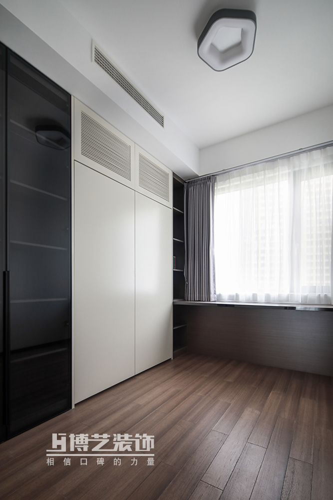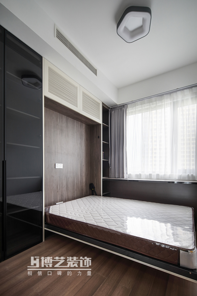 北次臥靠墻打書柜,添置一張墨菲床收起來美觀且解放空間,暫時可做學習室或瑜伽室,未來可作為另一間兒童房。