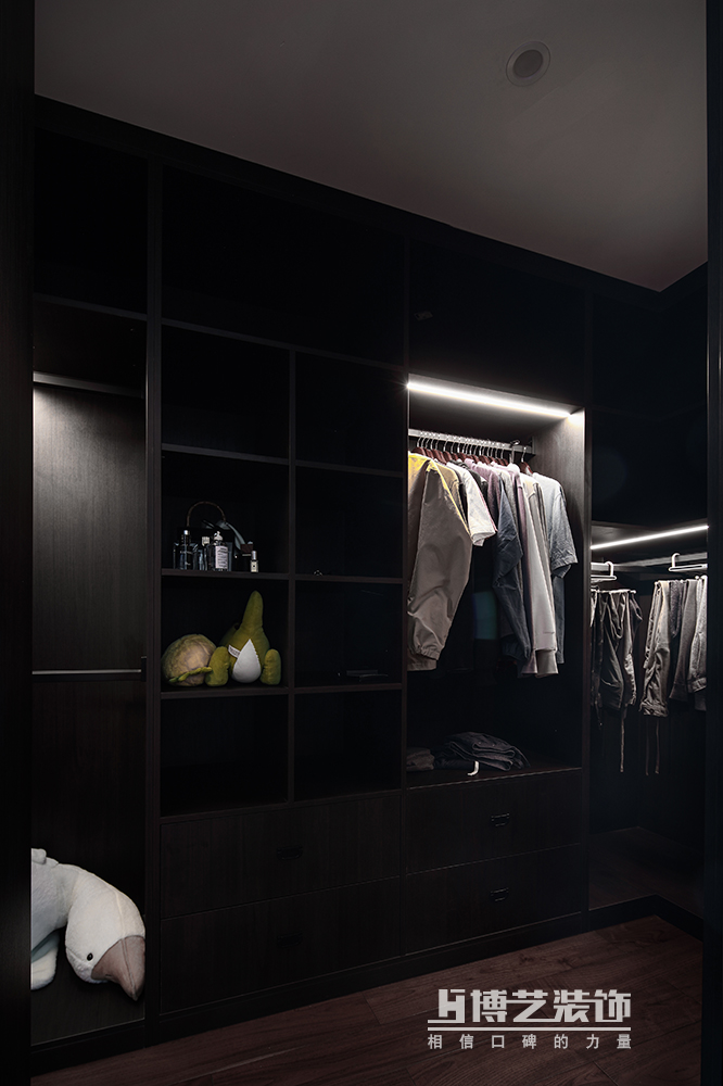 主臥依舊延續了極簡的基調,暖灰色的空間點綴深藍色的床靠,低飽和的色調有種莫名的治愈力,暗藏的燈光帶來高級的氛圍感,讓煩躁的心瞬間歸于平靜,安心睡個好覺。