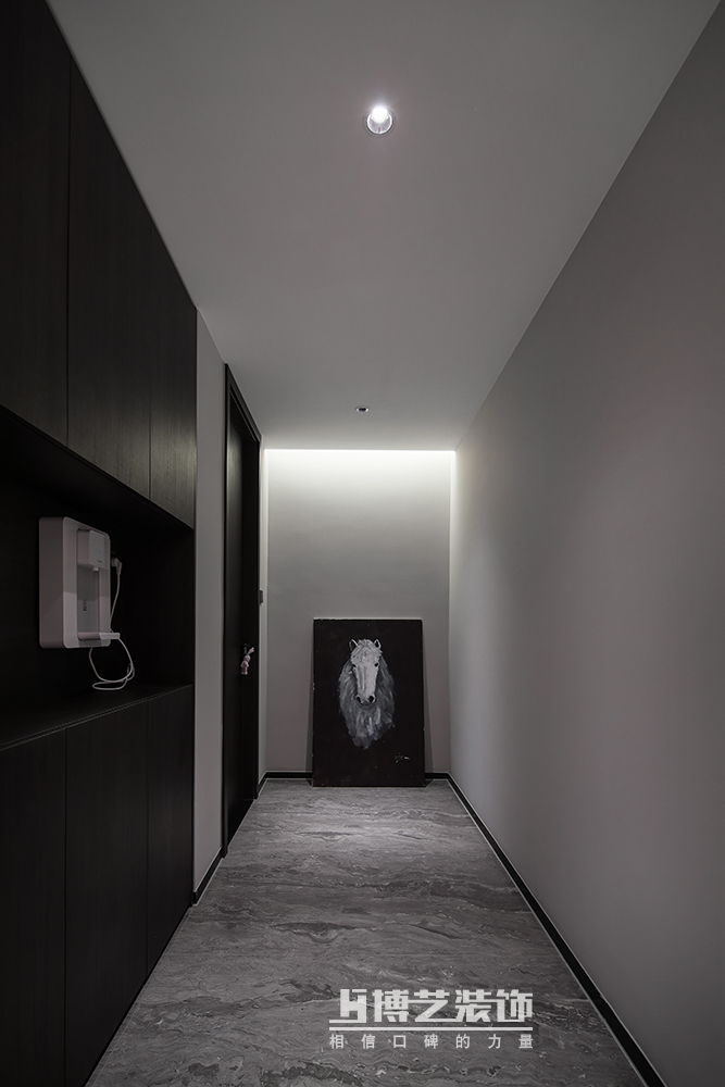 得益于一梯一戶的優勢,把鞋柜安置于門廳,讓客餐廳部分更完整。玄關順勢利用柱子做入戶造景,打破傳統,給予開門的儀式感。Kaws網紅公仔與亮面不銹鋼的結合,精致又不失個性,別具一格的潮流風。