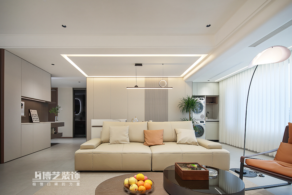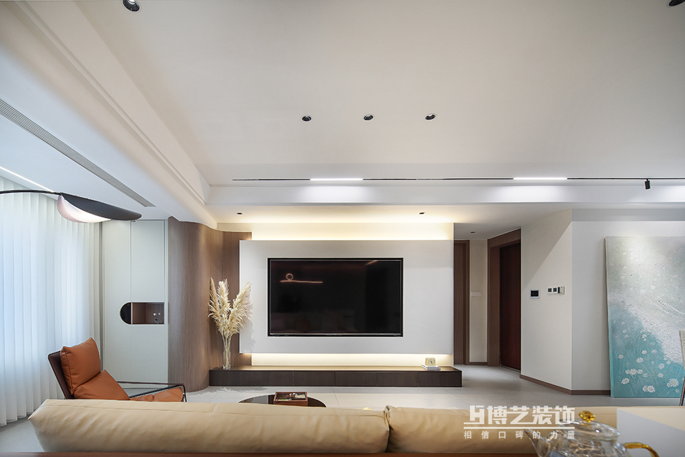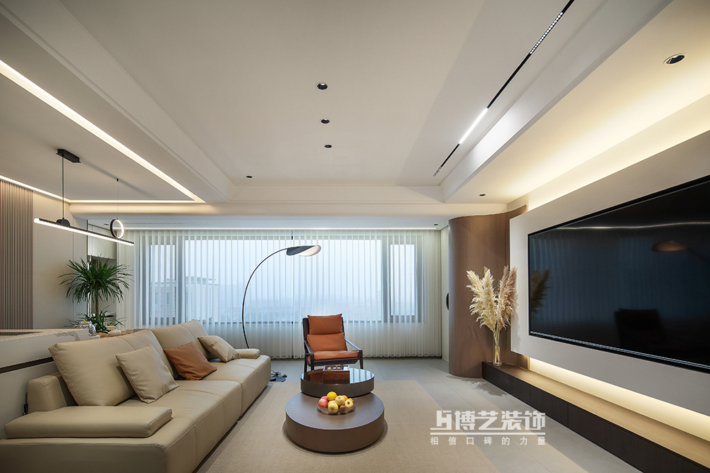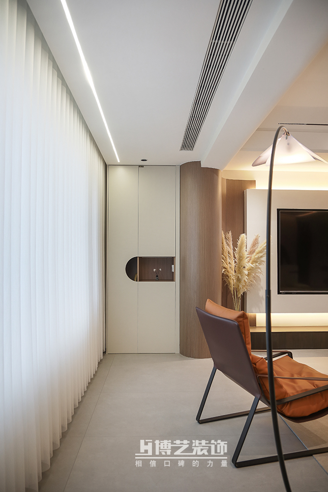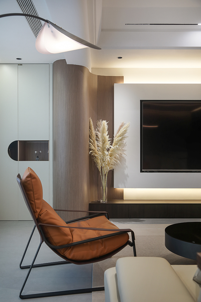 客廳與陽臺(tái)打通,擴(kuò)大空間,做弧形墻過渡,交互設(shè)計(jì)懸空電視墻,豐富空間形式,將設(shè)計(jì)感拉滿。