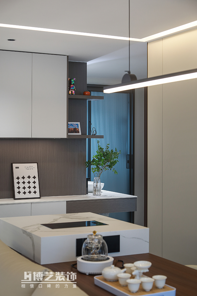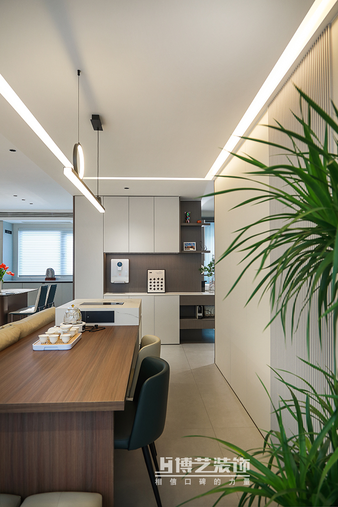 茶室與客廳相連,增加空間的通透性,同時(shí)也有利于增加家人間的互動(dòng)與親密,導(dǎo)臺(tái)的設(shè)計(jì)讓品茶更為科學(xué)方便。
