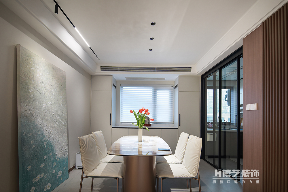 餐廳靠墻做柜子方便生活收納,裝飾畫明麗清新,為就餐平添幾分好心情。