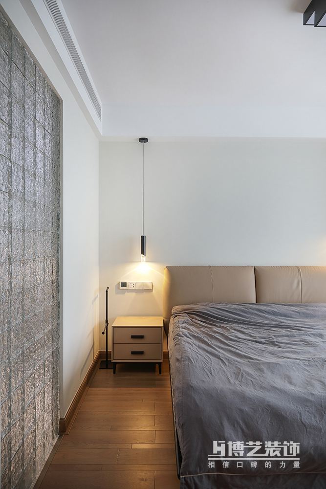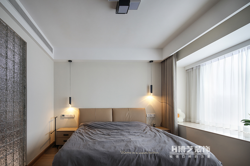 白色與奶咖色極簡(jiǎn)的運(yùn)用,營(yíng)造舒適靜謐的睡眠環(huán)境,高低錯(cuò)落的床頭燈讓空間變得有層次,暖色調(diào)的光帶來溫柔主義的氛圍。