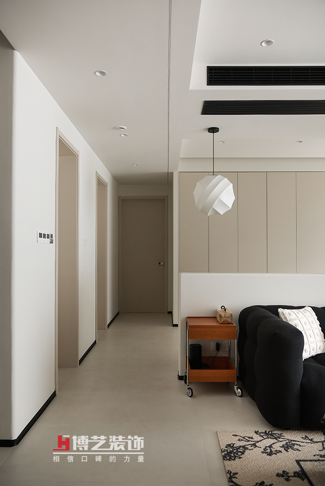 空間錯落有致,入戶玄關連通著客餐廳與書房,多個功能區共存于同一空間,在布局上各有乾坤,卻又互不影響。全屋無主燈設計,拉升了整個空間感,最大程度引入自然光,讓光影訴說不一樣的故事。
