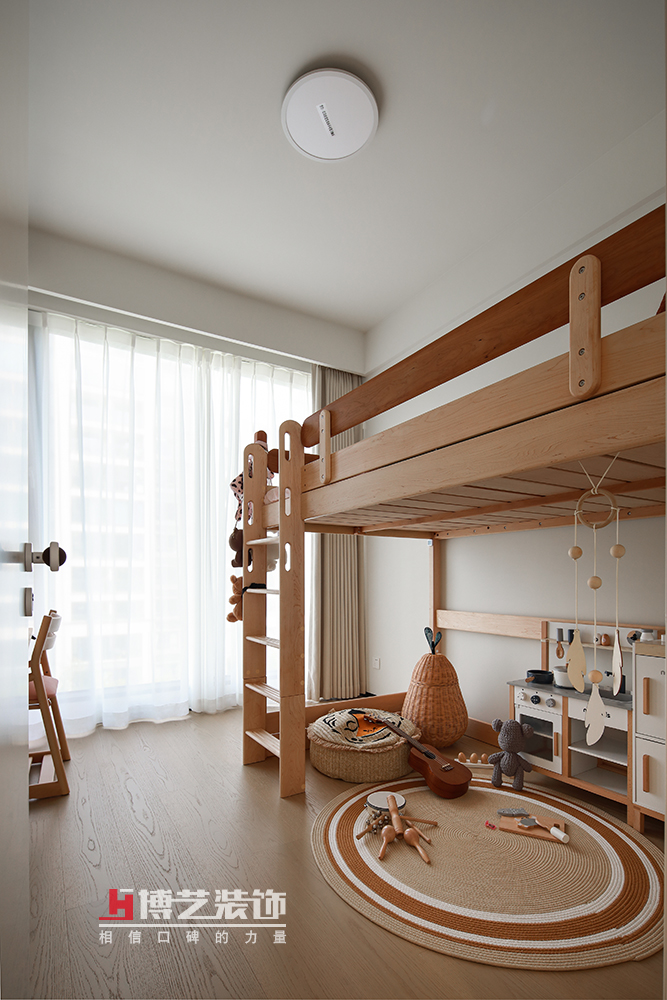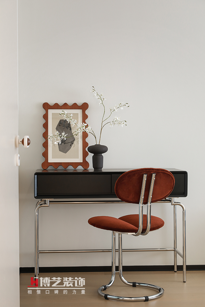 在客廳背面,與之緊緊相連的是一個開放式書房,區別于傳統密閉空間的書房,我們將書房進行了空間上的外放。不論是居家辦公,還是閑時閱讀創作,既能有一方專屬的天地,又讓自己不閉塞于物理空間中,創作思緒也隨之自由揮發。桌子、柜子的半隔斷設計,不僅區分了兩個空間,還兼具家居存儲收納作用。